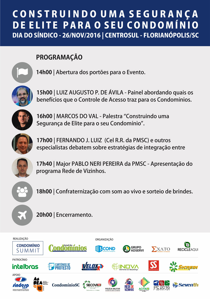 O evento atrai síndicos de todo o Estado, sendo que somente em Florianópolis estima-se que existam cerca de 7 mil condomínios. Entre os palestrantes do evento está o especialista em segurança pública mundial, Marcos do Val com o tema “Construindo uma Segurança de Elite para o seu Condomínio”. Marcos é instrutor da SWAT, batalhão especial de segurança da polícia americana, desde 2000, além de membro honorário e primeiro estrangeiro a fazer parte da seleta corporação localizada no Texas (EUA), a Texas Tactical Police Officers Association (TTPOA), associação dos policiais da SWAT. O palestrante também foi o criador de técnicas inovadoras de imobilizações táticas. Hoje ele é referência mundial em segurança pública. Do Val é o único brasileiro na história do setor de segurança pública a receber o visto de trabalho 01 do governo americano, dado somente a um seleto grupo que auxilia o Serviço de Proteção do País.
