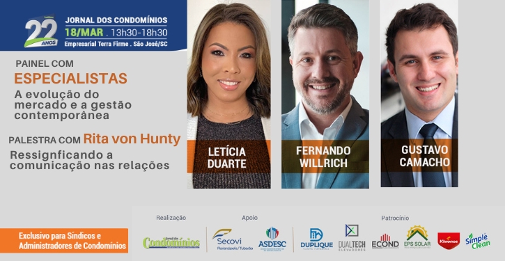 O painel terá o trio de especialistas formado por: Letícia Duarte, síndica profissional e idealizadora do canal Síndicos de Coragem no Instagram; Gustavo Camacho, advogado especialista em condomínios e presidente da Associação de Síndicos de Santa Catarina (ASDESC); e Fernando Willrich, advogado, empresário e presidente do Conselho Regional de Corretores de Imóveis de Santa Catarina (CRECI-SC).