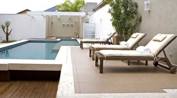 Há muita diversificação no mercado. Os móveis de material plástico são os mais populares para áreas de piscinas. Os preços baixos e a leveza para locomoção costumam ser atrativos. Alguns fabricantes adicionam ao polipropileno um protetor contra os raios ultravioleta, oferecendo mais durabilidade às mesas, cadeiras e espreguiçadeiras, que são constantemente expostas ao sol. Para a manutenção desse material, devem ser evitados produtos que contenham amoníaco ou cloro, os quais deterioram o plástico. O arquiteto Zanoni faz ressalvas com relação a esse tipo de produto. “No comércio de móveis de plástico encontramos muita variação de qualidade. É preciso saber o que se está comprando para não se arrepender depois”, alerta.