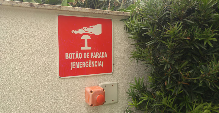 • Botoeira de desligamento da bomba da piscina em caso de pânico, localizada em local visível ao lado da piscina, com uma placa indicativa de cor branca, com a frase em vermelho: “Para desligar a bomba pressione o botão”.