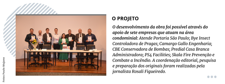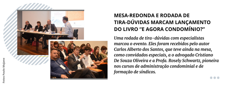 Os empresários que apoiaram o desenvolvimento do projeto “E agora Condomínio? Gestão de riscos operacionais, uma cultura, uma necessidade” prestigiaram o lançamento da obra e conversaram com síndicos e profissionais da área em uma rodada de tira-dúvidas que marcou o evento na tarde e início da noite do último dia 9 de novembro, no Auditório Spazio JK, na zona Sul de São Paulo. Eles foram recebidos pelo autor Carlos Alberto dos Santos, que teve ainda na mesa, como convidados especiais, a o advogado Cristiano De Souza Oliveira e a Profa. Rosely Schwartz, pioneira nos cursos de administração condominial e de formação de síndicos.