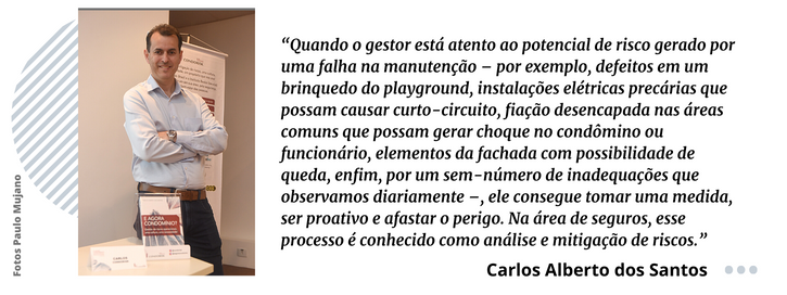 A preocupação crescente com a segurança das instalações e usos das edificações brasileiras, motivada por incêndios, acidentes de trabalho ou colapsos estruturais registrados nas últimas décadas, legou ao País um inequívoco aprimoramento das normas técnicas de Engenharia e Arquitetura, das regulamentações trabalhistas, da legislação de prevenção e combate a incêndio, da normatização quanto à manutenção dos elevadores etc. Entretanto, a aculturação de gestores, profissionais e condôminos em torno da necessidade de estarem constantemente atentos à mitigação dos riscos nesses espaços não acompanhou esse ritmo. Aplicando a perspectiva da análise e mitigação de riscos do ramo securitário nas edificações, o especialista Carlos Alberto dos Santos vistoriou cerca de 500 condomínios nos últimos dez anos, através da Condorisk do Brasil, trabalho que ele apresenta no livro “E Agora Condomínio? Gestão de riscos operacionais, uma cultura, uma necessidade”.