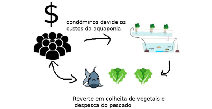 Em um sistema integrado chamado de "aquaponia". Aquaponia â é um sistema de cultivo que une a Piscicultura (cultivo de peixes) e a Hidroponia (cultivos de plantas sem o uso de solo), com as raízes submersas. cujo objetivo é desenvolvimento de um meio de produção de alimentos em larga escala sustentável, que não necessita de tantos recursos e menos poluente do que meios tradicionais. Valorizando os alimentos produzidos de forma responsável. A origem dos alimentos, o impacto ao meio ambiente, a valorização da comunidade produtora, condomínios, condômino, tudo isto deve ser buscado com esse simples modelo de negócio.