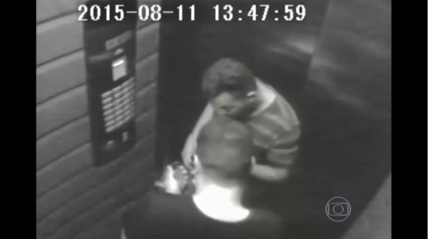 Às 13h47 da tarde do dia 11 de agosto, uma terça-feira, as câmeras de segurança mostram os dois bandidos no elevador de serviço. No vídeo, é possível, é possível reparar que um está de camiseta listrada. Eles mexem nos celulares e olham para baixo o tempo todo para evitar as câmeras, mas um deles se distrai e olha pra cima.