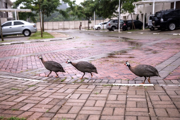 Galinhas-d'angola liberadas no condomínio do Morumbi, zona oeste de São Paulo.