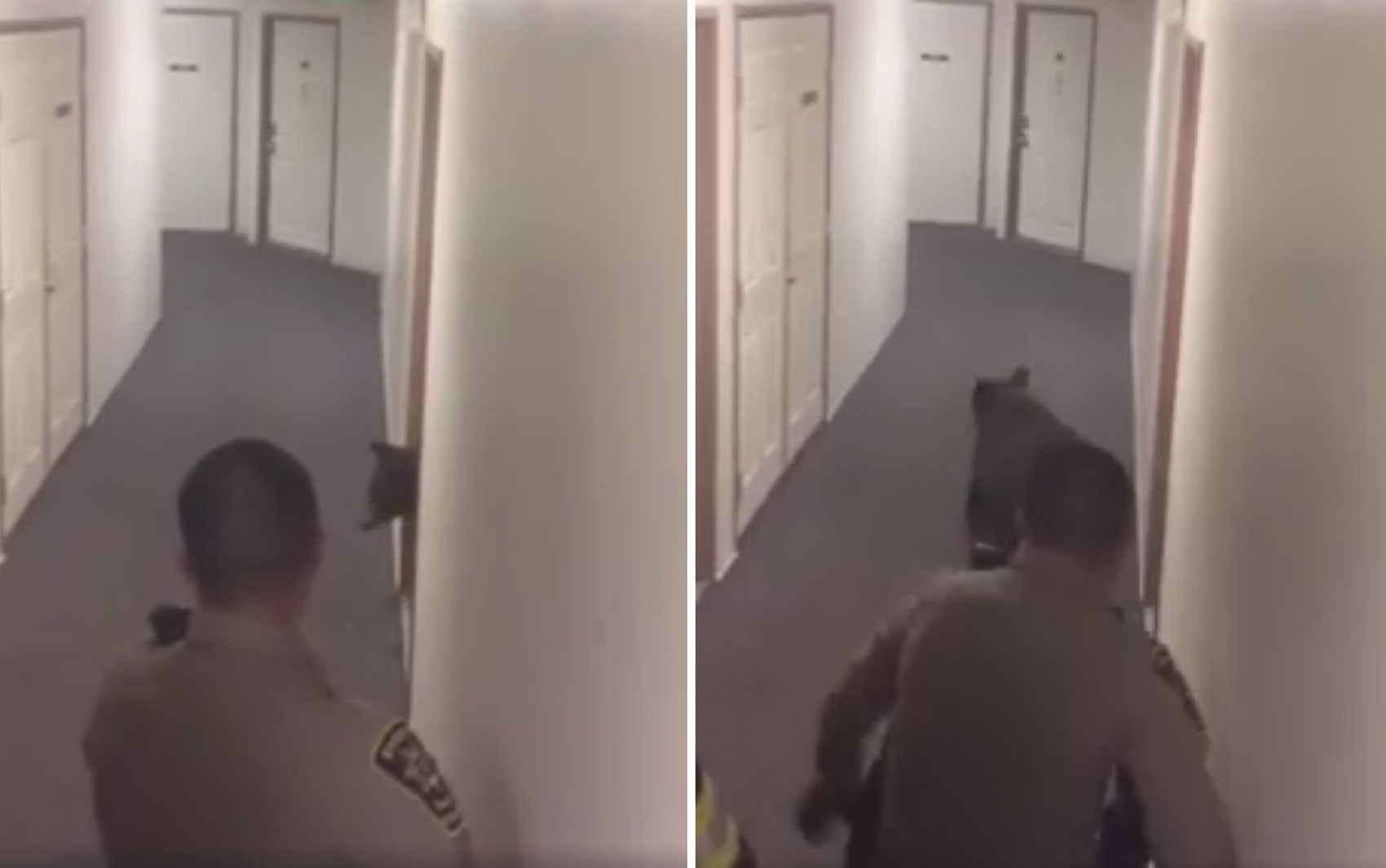 Um vídeo divulgado pelos bombeiros mostra quando eles se aproximam da entrada do apartamento e um deles abre a porta. O animal então coloca a cabeça para fora para ver quem está chegando. Assustado, ele sai correndo e é seguido calmamente pelos policiais e bombeiros do distrito de Eagle River que atenderam ao chamado.