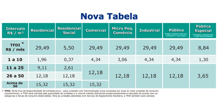 A principal mudança na nova tabela é o fim do consumo mínimo de 10 metros cúbicos, cujo valor atualmente é de R$ 45,19. Em seu lugar entra uma tarifa pela disponibilidade do serviço, no valor de R$ 29,49, e a partir daí uma cobrança pelo consumo efetivamente apontado no hidrômetro. Entre 1 e 10 metros cúbicos, por exemplo, o valor é de R$ 1,96 por metro cúbico (a cada mil litros). E entre 11 e 25 metros cúbicos o valor passa para R$ 9,11 (Veja tabela abaixo).