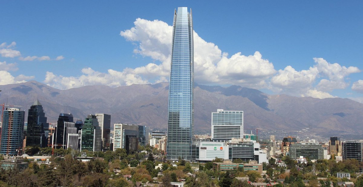 Agora vamos para Santiago, no Chile. Este prédio, parte do Costanera Center – o maior complexo financeiro da cidade -, teve como um dos projetistas o famoso arquiteto argentino Cesar Pelli, apresenta 70 andares – sendo seis deles no subsolo – e foi inaugurado em 2013.