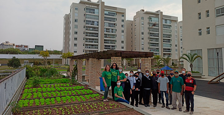 O Mirante Quatro Estações, localizado no bairro Serraria, em São José, é um dos espaços que preza por ações de sustentabilidade. O condomínio, que tem 1.190 moradores e 240 apartamentos em seis torres possui, entre outras iniciativas, uma horta mantida pelos próprios condôminos. O síndico Dalmo Mayer Tibincoski explica que ouvir as pessoas que vivem no local é muito importante para saber o que implantar.