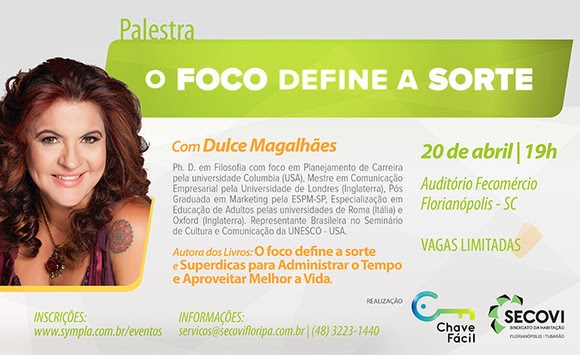 No dia 20/04, Dulce faz uma palestra no auditório da Fecomércio, em Florianópolis/SC, em evento promovido pelo SECOVI Florianópolis/Tubarão. O encontro inicia às 19h com welcome coffe e tem vagas limitadas.
