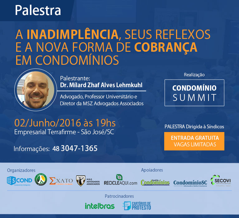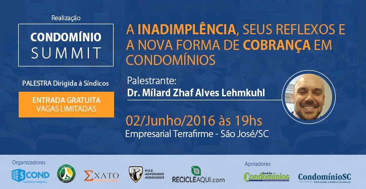 Com o advento do Novo Código de Processo Civil (CPC) que entrou em vigor no dia 18/03/2016 - Lei nº 13.105/2015, algumas mudanças vão agilizar o processo de cobrança das cotas condominiais em atraso. Pensando em trazer esclarecimentos aos Síndicos e profissionais da área, o Condomínio Summit está organizando a palestra com o tema: A InadimpleÌncia, seus Reflexos e a Nova Forma de Cobrança em Condomínio.