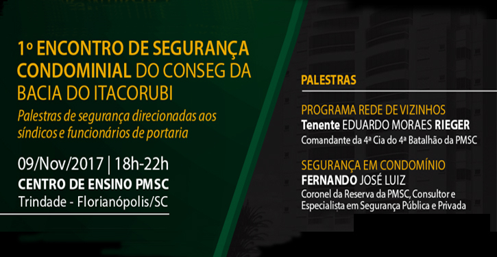 Incrição em: https://www.sympla.com.br/1-encontro-de-seguranca-condominial-do-conseg-da-bacia-do-itacorubi__208954