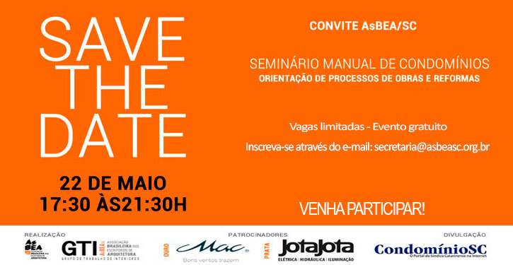 A AsBEA/SC (Associação Brasileira de Escritórios de Arquitetura – regional SC), através do GTI (Grupo de Trabalho de Interiores) convida os síndicos para o Seminário de apresentação do Manual de Condomínios – orientação para processos de obras e reformas.