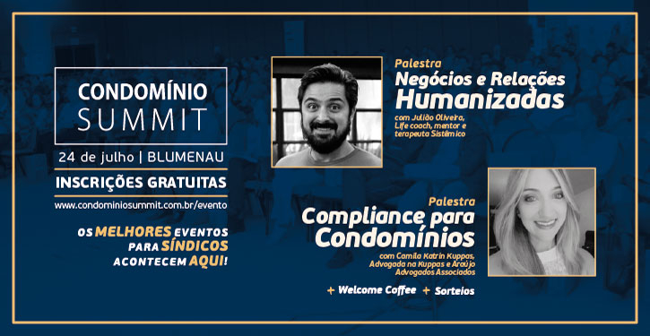 O Condomínio Summit segue com sua versão On The Road pela cidade de Blumenau, dia 24 de julho, no Hotel Himmelblau, a partir das 19hs. Trará dois assuntos relacionados à gestão dos síndicos: A importância e vantagens de realizar o Compliance Condominial, sistema que garante através de boas práticas a transparência e excelência na administração predial, com a especialista Camilla Katrin Kuppas e a palestra Negócios e relações humanizadas, com Julião Oliveira, life coach, mentor e terapeuta sistêmico, que vai falar sobre as questões centrais nas relações humanas condominiais.