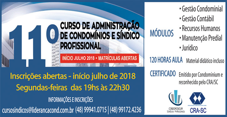 Com o crescimento acelerado da verticalização e a sofisticação dos empreendimentos imobiliários, a administração de condomínios ganha, a cada dia, uma abordagem mais profissional. Para oferecer uma plataforma de informações e um diferencial competitivo para os interessados em se lançar na carreira que mais cresce no setor de condomínios de Santa Catarina, a Condominium síndicos profissionais, CRA/SC e Liderança Administradora de Condomínios abrem inscrição para a 11ª turma do Curso de Administração de Condomínios e Síndicos Profissional em Florianópolis.