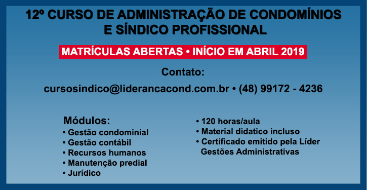 Visando fornecer uma visão sistêmica e operacional do condomínio residencial, comercial, empresarial e mistos às pessoas que desejam ingressar na profissão de síndico profissional, ou aos que já cumprem esse papel nos condomínios, a Líder Gestões Administrativas (LGA) em parceria com a Liderança Administradora de Condomínios abre inscrição para a 12ª turma do Curso de Administração de Condomínios e Síndicos Profissional em São José.