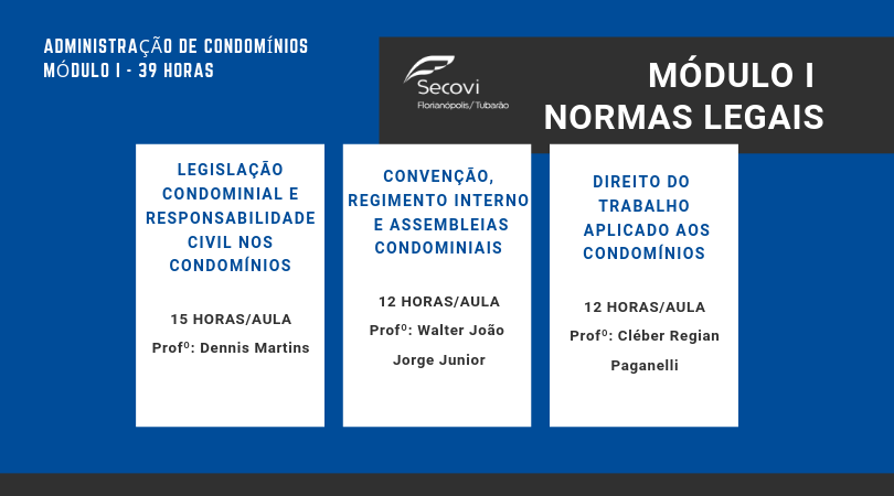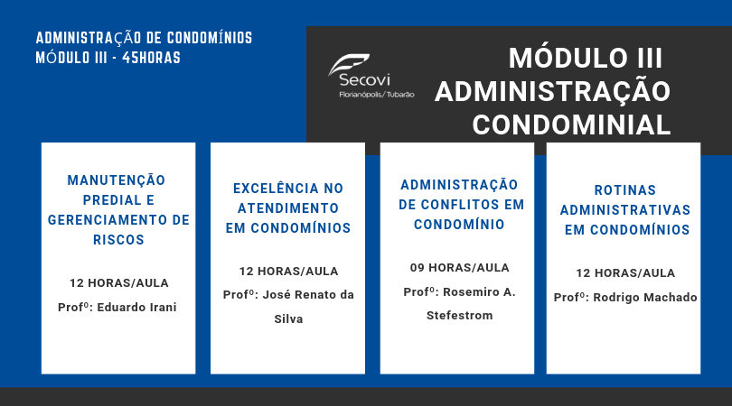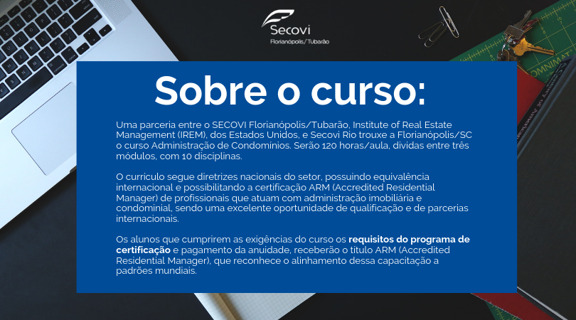 O Curso de Administração de Condomínio do SECOVI - Sindicato da Habitação de Florianópolis e Tubarão tem o objetivo de contribuir com a profissionalização do mercado através do exercício eficaz da administração condominial, oferecendo de forma integrada e multidisciplinar a aquisição de conhecimentos fundamentais e básicos que propiciem o desenvolvimento de competências profissionais, habilidades e atitudes propositivas para a gestão e administração qualificada de condomínios.