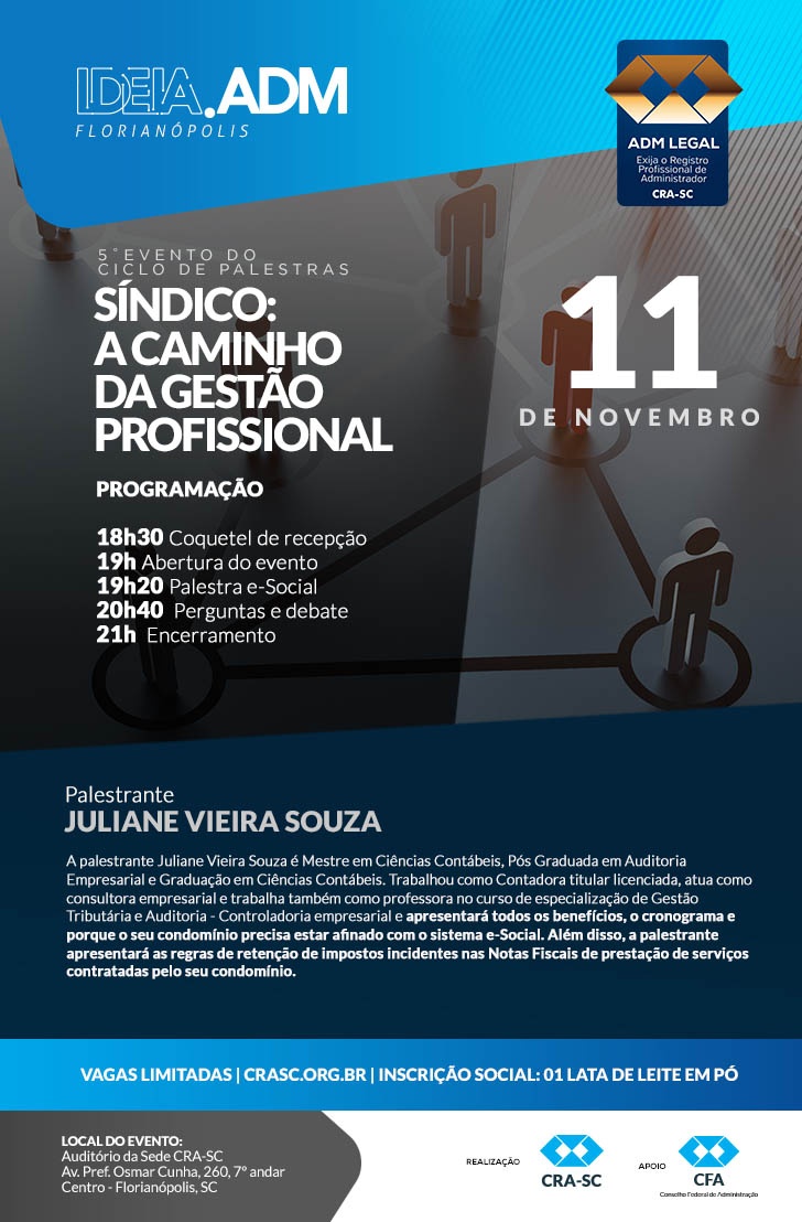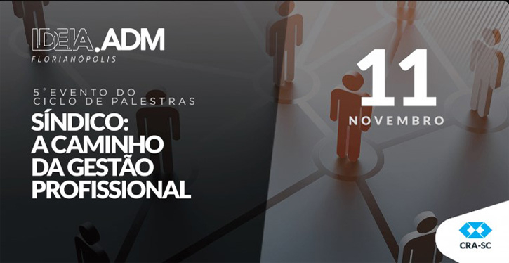 O CONSELHO REGIONAL DE ADMINISTRAÇÃO DE SANTA CATARINA - CRA-SC apresenta o IDEIA.ADM 2019 com o 5ËEVENTO DO CICLO DE PALESTRAS SÍNDICO: A CAMINHO DA GESTÃO PROFISSIONAL com palestra ministrada por JULIANE VIEIRA SOUZA