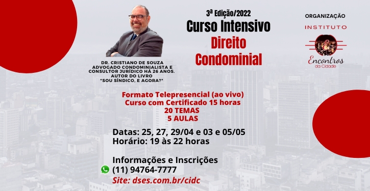 As aulas ocorrerão nos dias 25, 27, 29 de abril, e 03 e 05 de maio. Estas serão ministradas na modalidade telepresencial (aulas ao vivo - online) pelo Professor Cristiano De Souza Oliveira, Advogado e Consultor Jurídico que conta com mais de 25 anos de experiência na área condominial - Autor do Livro: Sou síndico, e agora? Reflexões sobre o Código Civil e a vida condominial em 11 lições.