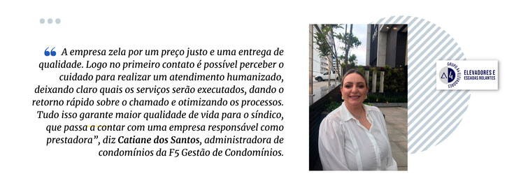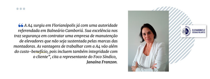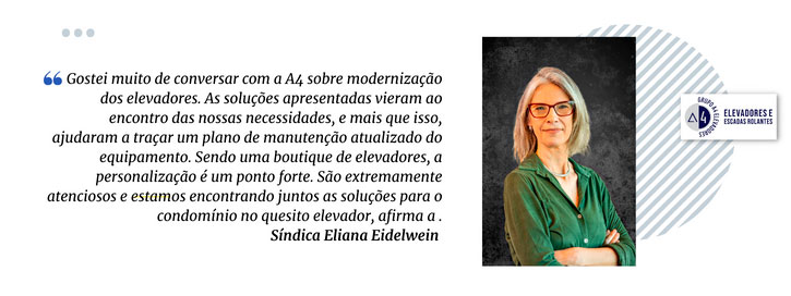 Atuando há quatro anos como síndica na região continental de Florianópolis, Eliana Eidelwein encontrou na A4 Elevadores a segurança necessária para lidar com serviços de manutenção nos equipamentos dos condomínios que administra.